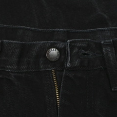 Vải denim dày vừa, mặt vải thô đặc trưng kiểu Mỹ, màu đen phai tông xám, ống quần trái được vẽ custom