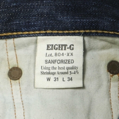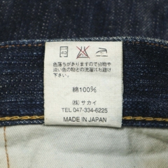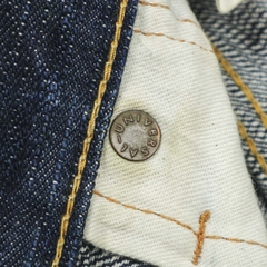 Vải selvedge denim dày ~ 19oz, mặt vải thô sần loại sợi không đồng đều, selvedge màu trắng hồng, gấu quần chainstitch nguyên bản, cúc gài donut nguyệt quế, đinh tán Universal, màu indigo đậm rất mới