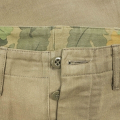 Bản collab giữa Journal Stanrdard & The Hill-Side, vải selvedge denim dệt left-hand, màu nâu nhạt, vải mỏng vừa & hơi thô nhẹ, cúc gài