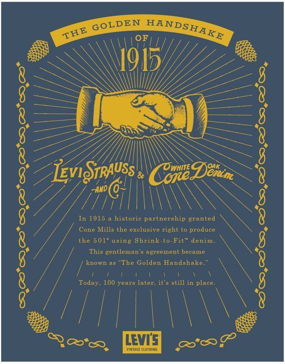 Đến 1915, Levi’s hợp tác với Cone Mills, một nhà máy dệt tại North Carolina, nhằm nâng cấp chất lượng vải denim. Việc hợp tác được đặt tên "The Golden Handshake" để minh chứng cho giá trị của quyết định mang tính lịch sử này.