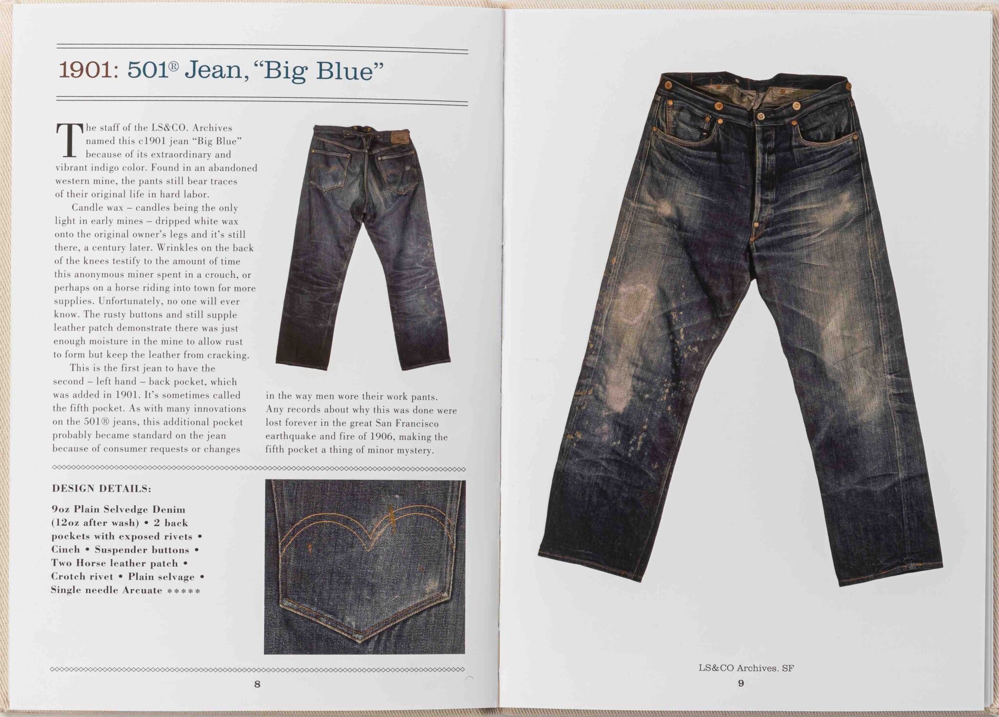 Mãi đến năm 1901 hãng Levi’s mới bổ sung thêm túi sau bên trái theo yêu cầu từ khách hàng. Kể từ thời điểm đó chiếc quần 501 với năm túi được hoàn thiện, trở thành tiêu chuẩn & tương đối giữ nguyên kết cấu đến ngày nay. Thuật ngữ “jeans” thay cho waist overalls được phổ biến rộng rãi vào giai đoạn 1950s trở đi.