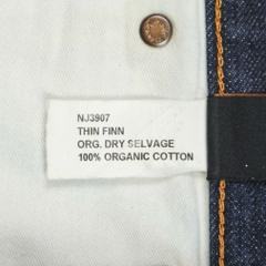 Vải sevedge denim dày vừa, mặt vải thô nhẹ, selvedge trắng cam, gấu quần chainstitch nguyên bản, selvedge coin-pocket