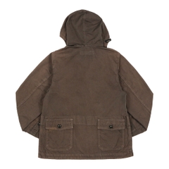 Vải dày vừa, mặt vải mịn, khoá kéo to bản, có dây rút ở nón, sau lưng có 2 túi