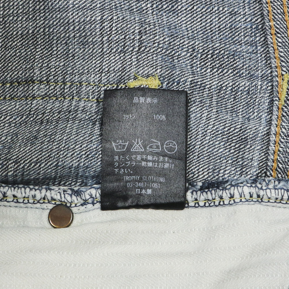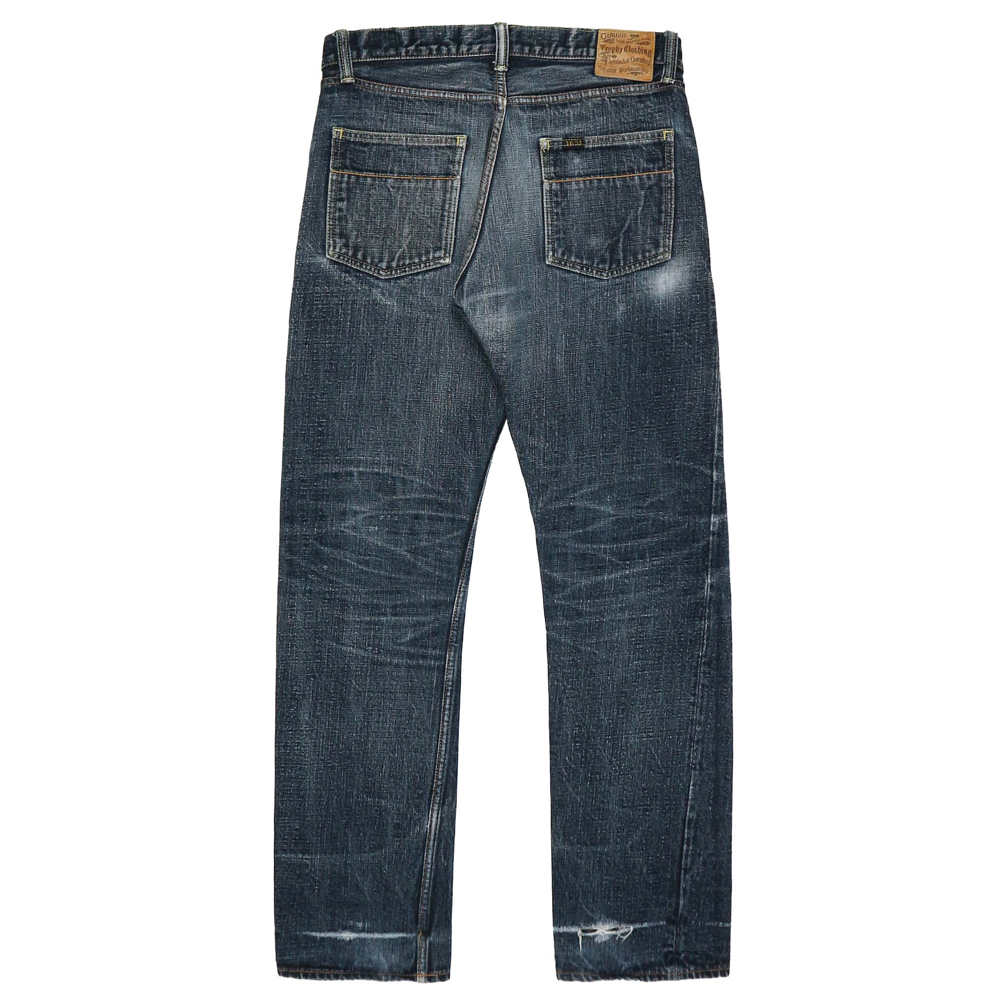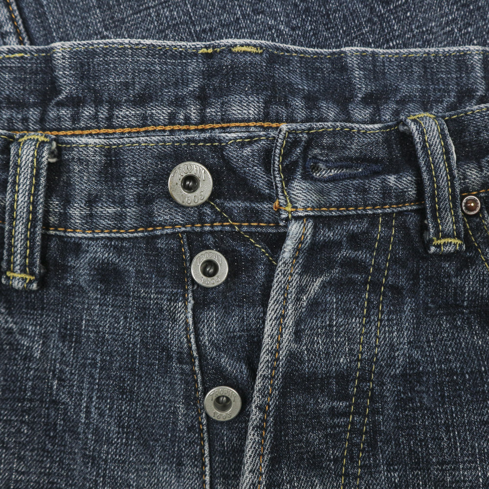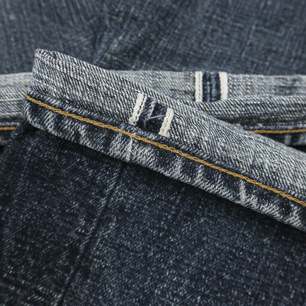 Vải selvedge denim dày vừa, mặt vải thô, gấu quần chainstitch gốc, selvedge 2 màu, cúc gài donut, màu fade từ raw denim