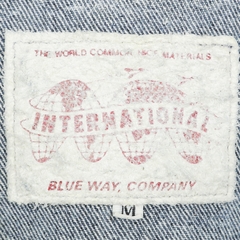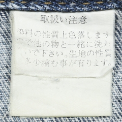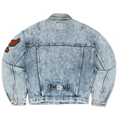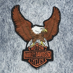 Vải denim dầy dặn, mặt vải thô, màu acid wash, may patch Harley Davison bên tay trái, 90s boxy fit thân áo ngắn, có cinback, cúc Scovill