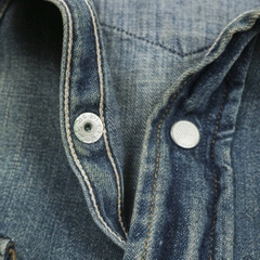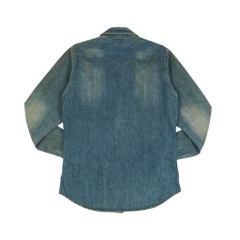 Vải denim dày vừa, mặt vải thô nhẹ, cúc bấm Universal, màu “dirty wash” bẩn vàng kiểu vintage, Blue Bell label